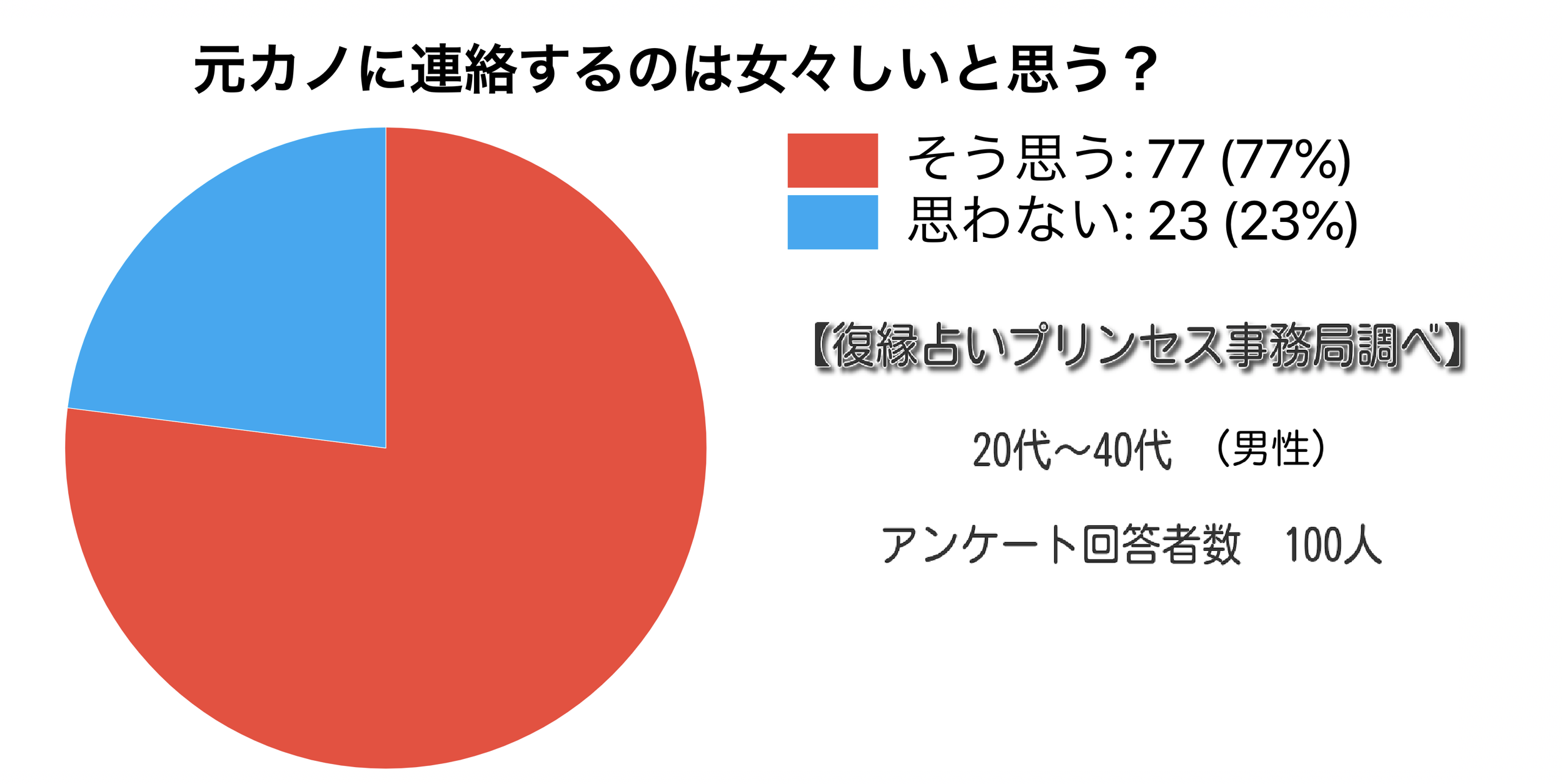 無作為に選出した20代から40代の男性100名を対象に、「振った元カノに連絡したことはある?」「元カノに連絡するのは女々しいと思う?」「連絡した元カノとはその後やり直した?」などを尋ねました。